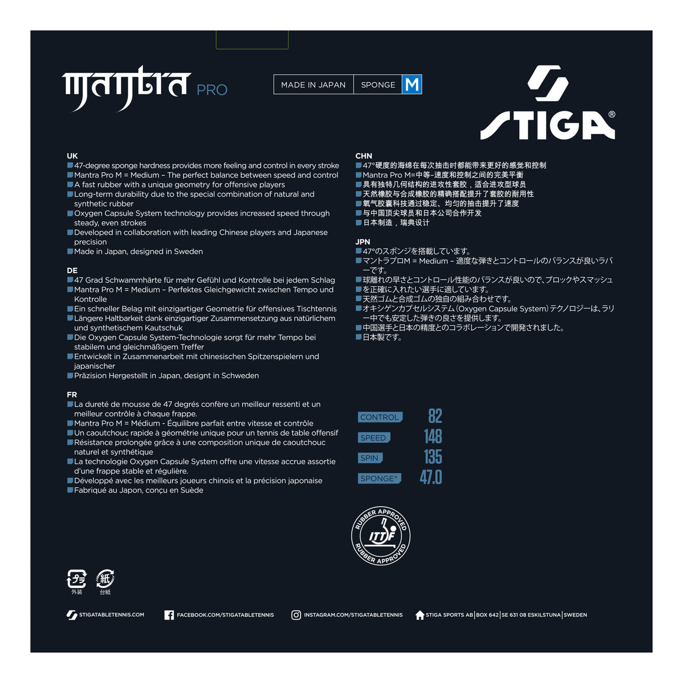 Stiga Mantra Pro M delivers a medium-hard sponge (~47.5°) combined with advanced ESC (Enlarged Sponge Cell) technology for players who want a perfect fusion of control, spin, and power. This rubber offers the consistency needed for aggressive topspin rallies while maintaining reliable ball control and precision.